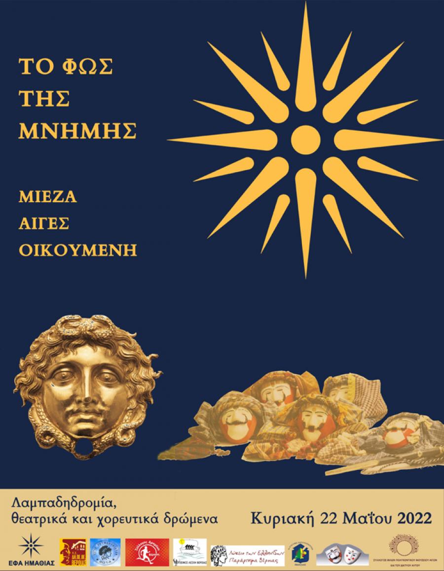 Ενώνουμε γιορτές -την μέρα των μουσείων και τις «πράσινες πολιτιστικές διαδρομές»- και ενώνουμε δυνάμεις – η Εφορεία Αρχαιοτήτων Ημαθίας, ο Σύλλογος των Φίλων του Πολυκεντρικού Μουσείου των Αιγών και του Δικτύου του, το ΔΗ.ΠΕ.ΘΕ. Βέροιας, ο «Σύλλογος Δρομέων Βέροιας», το Λύκειο Ελληνίδων Βέροιας, ο όμιλος «Γενίτσαροι και Μπούλες Νάουσας», η «Εστία Ρουμλουκιωτών Αλεξάνδρειας», η «Εύξεινος Λέσχη Βέροιας» και το 3ο Σύστημα Προσκόπων Βέροιας– και γιορτάζουμε όπως οι αρχαίοι με μια μαραθώνια λαμπαδηδρομία 40 χιλιομέτρων, με μουσικές, χορούς και θεατρικά δρώμενα την μνήμη των Μακεδόνων που ξεκινώντας από αυτά τα χώματα άλλαξαν την ιστορία του κόσμου!