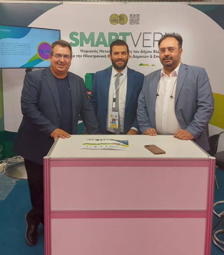 Το σταντ του Δήμου στο περίπτερο 15 επισκέφθηκαν το Σάββατο, 1.10.2022, ο Δήμαρχος Βέροιας κ. Κωνσταντίνος Βοργιαζίδης και ο Αντιδήμαρχος Καθαριότητας, Περιβάλλοντος, Ανακύκλωσης & Πολιτικής Προστασίας κ. Βασίλης Παπαδόπουλος, όπως και ο Βουλευτής Ημαθίας, κ. Άγγελος Τόλκας, οι οποίοι σημείωσαν την αξία του ψηφιακού μετασχηματισμού στη σύγχρονη ζωή και τη διευκόλυνση της καθημερινότητας των πολιτών, στο πλαίσιο της ανάπτυξης των έξυπνων πόλεων.