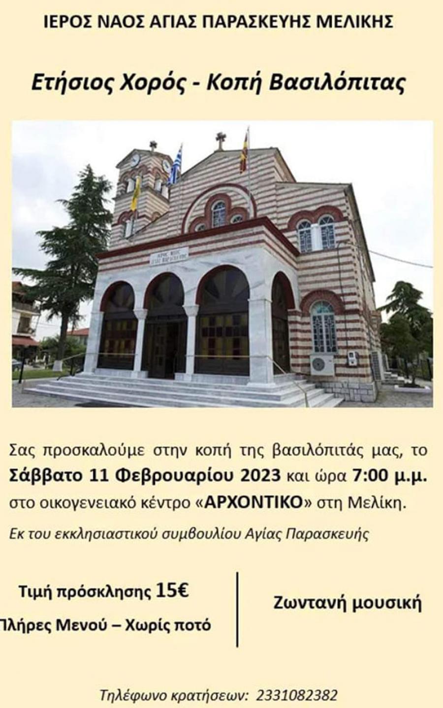 Το εκκλησιαστικό συμβούλιο της Αγίας Παρασκευής Μελίκης Ημαθίας καλεί όλους τους ενορίτες στον Ετήσιο χορό - Κοπή βασιλόπιτας.