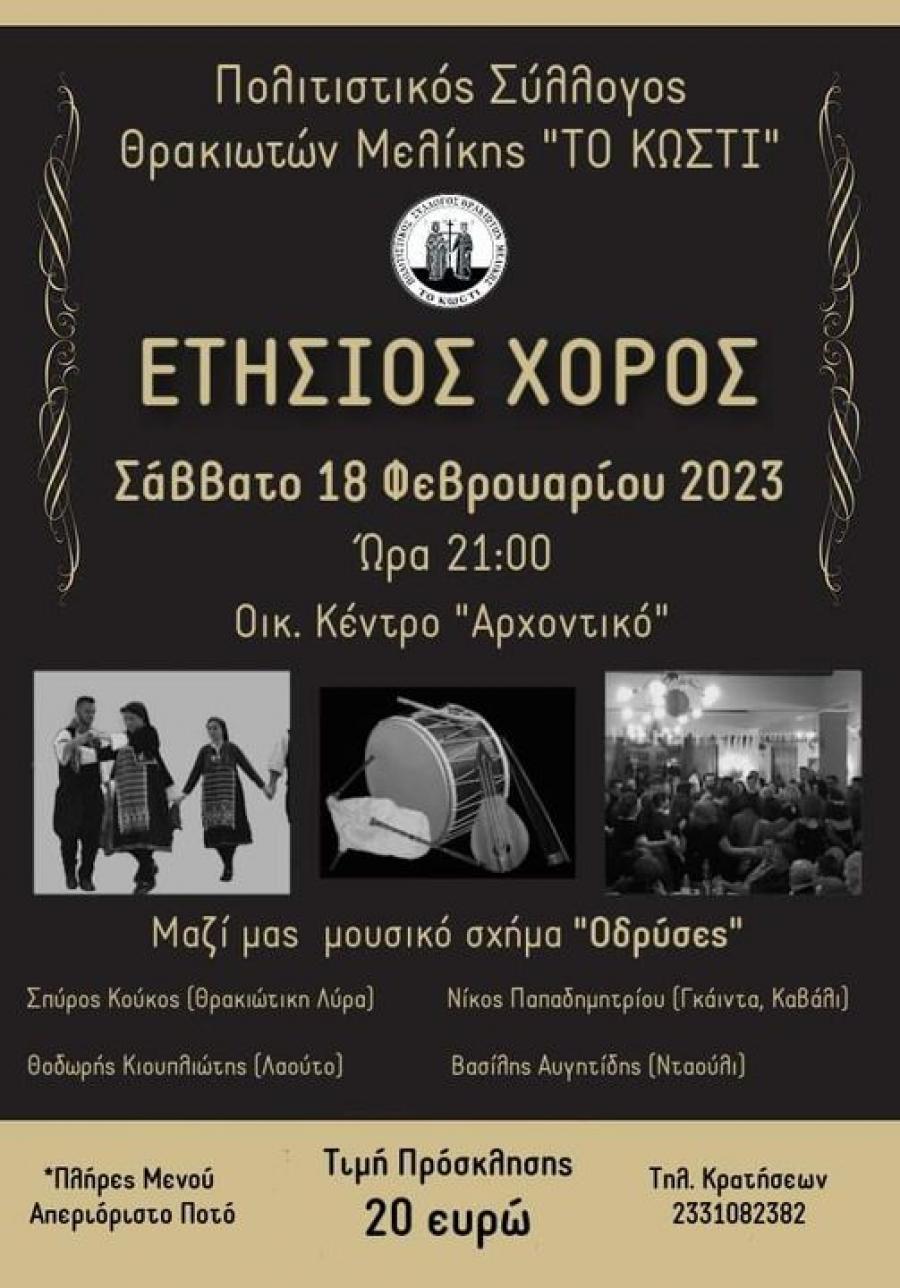 Τον ετήσιο χορό του διοργανώνει και φέτος ο Πολιτιστικός Σύλλογος Θρακιωτών Μελίκης "Το Κωστί". Η πολλά υποσχόμενη βραδιά κεφιού, χορού και διασκέδασης θα γίνει το Σάββατο 18 Φεβρουαρίου και ώρα 9 το βράδυ, στο οικογενειακό λέντρο "Το Αρχοντικό" στη Μελίκη.