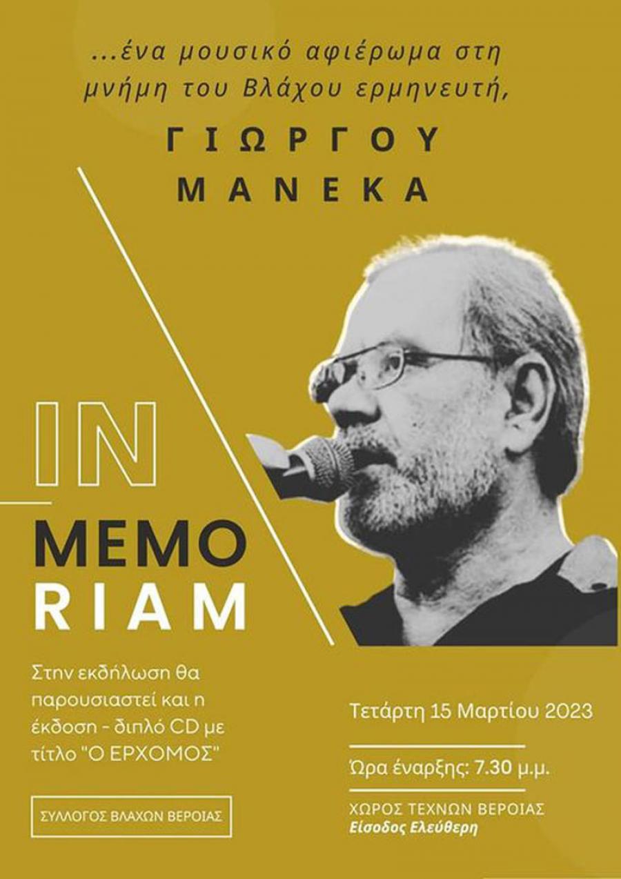 Ο Σύλλογος Βλάχων Βέροιας σας προσκαλεί σε μία πολύ ενδιαφέρουσα εκδήλωση όπου το παρελθόν συναντάται με το παρόν και το μέλλον, την Τετάρτη στις 15 Μαρτίου, στις 7.30 μ.μ. στον Χώρο Τεχνών Βέροιας. Πρόκειται για ένα μουσικό ταξίδι αφιερωμένο "in memoriam" - στη μνήμη του Βλάχου ερμηνευτή, Γιώργου Μανέκα.