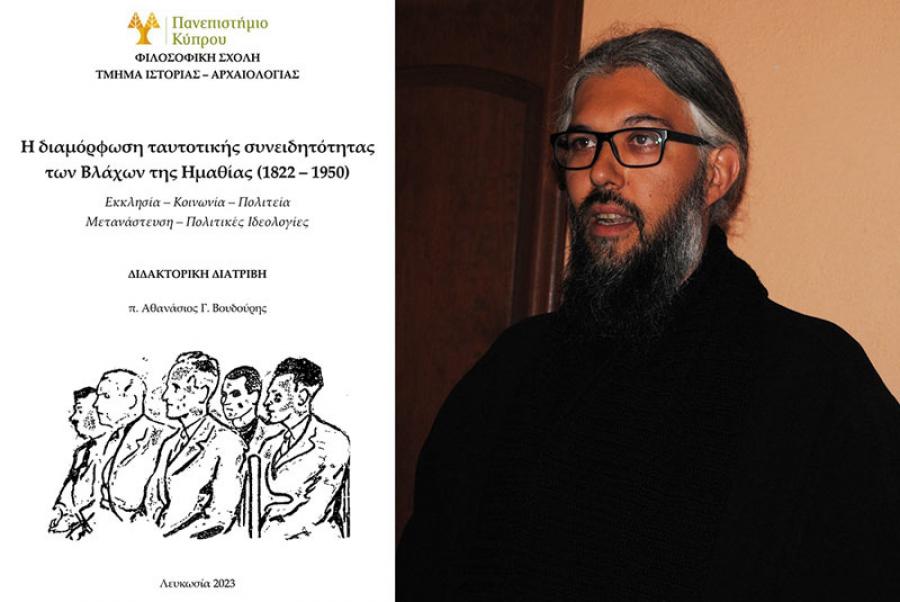 Την Τρίτη 06 Ιουνίου 2023, σε συνεδρίαση του Τμήματος Ιστορίας – Αρχαιολογίας της Φιλοσοφικής Σχολής του Πανεπιστημίου Κύπρου,κρίθηκε η διδακτορική διατριβή του π. Αθανασίου Γ. Βουδούρη, με τίτλο: «Η διαμόρφωση ταυτοτικής συνειδητότητας των Βλάχων της Ημαθίας (1822 – 1950).Εκκλησία – Κοινωνία – Πολιτεία – Μετανάστευση – Πολιτικές Ιδεολογίες». Η διατριβή εγκρίθηκε με τη σύμφωνη γνώμη των παρισταμένων στη συνεδρίαση καθηγητών Γεωργίου Καζαμία, Πέτρου Παπαπολυβίου, Στράτου Δορδανά και Δημήτρη Κοντογεώργη.