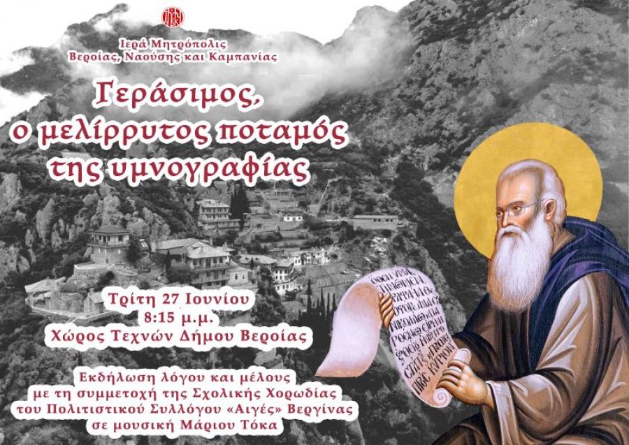 Την Τρίτη 27 Ιουνίου στις 8:30 μ.μ. στο Χώρο Τεχνών του Δήμου Βεροίας θα πραγματοποιηθεί η κεντρική καλλιτεχνική εκδήλωση των «ΚΘ´ Παυλείων» με θέμα: «Γεράσιμος, ο μελίρρυτος ποταμός της υμνογραφίας», αφιερωμένη στον νέο Άγιο της Εκκλησίας μας, Όσιο Γεράσιμο τον Υμνογράφο – Μικραγιαννανίτη.