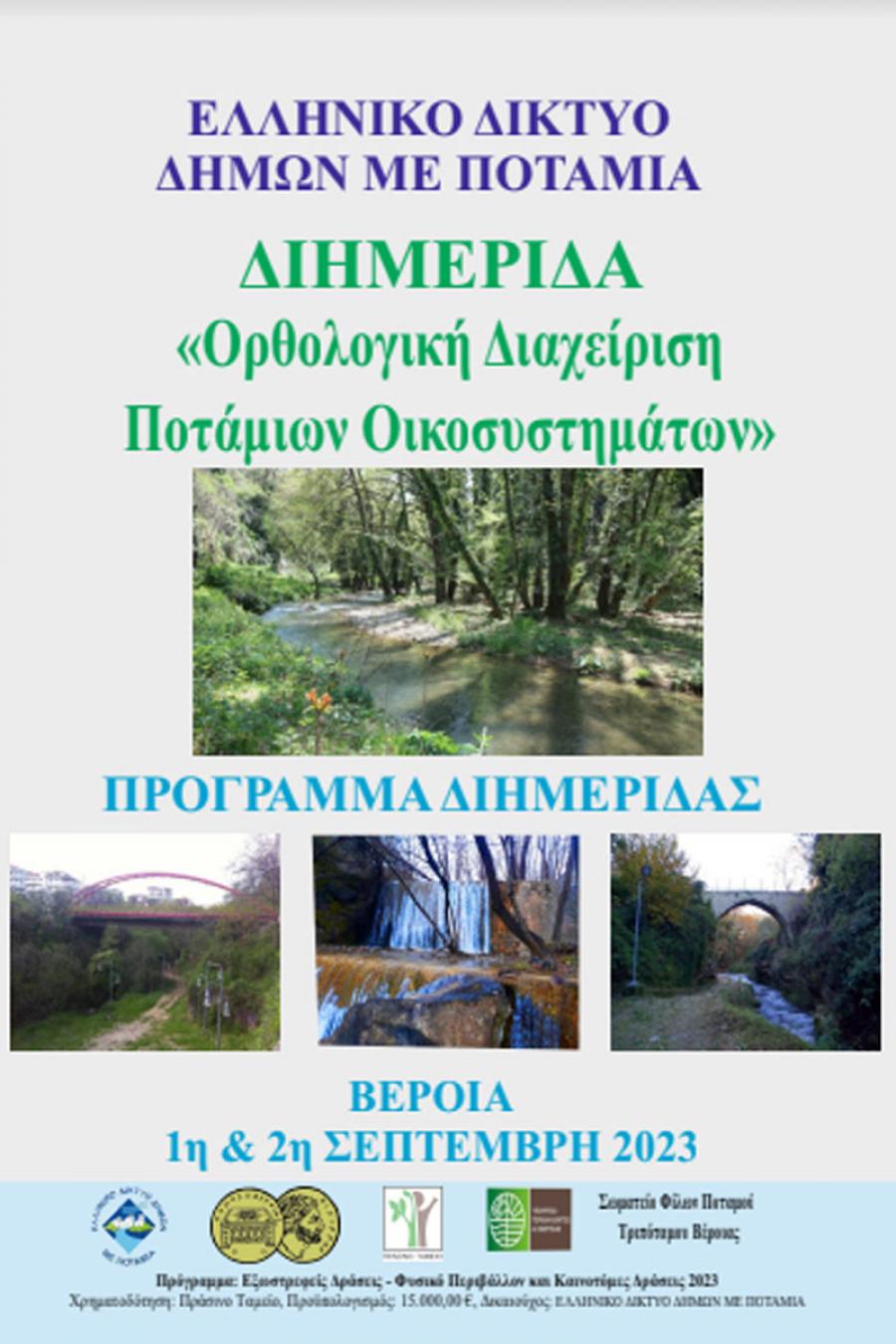 Διημερίδα με θέμα την «Οικολογική διαχείριση ποταμιών οικοσυστημάτων» διοργανώνει στη 1 και στις 2 Σεπτεμβρίου 2023 το Ελληνικό Δίκτυο Δήμων με Ποτάμια. Η διημερίδα πραγματοποιείται σε συνεργασία με τον Δήμο Βέροιας, ωςσυνδιοργανωτή και μέλος του Δικτύου, και με τον Σύλλογο Φίλων Ποταμού Τριποτάμου Βέροιας.