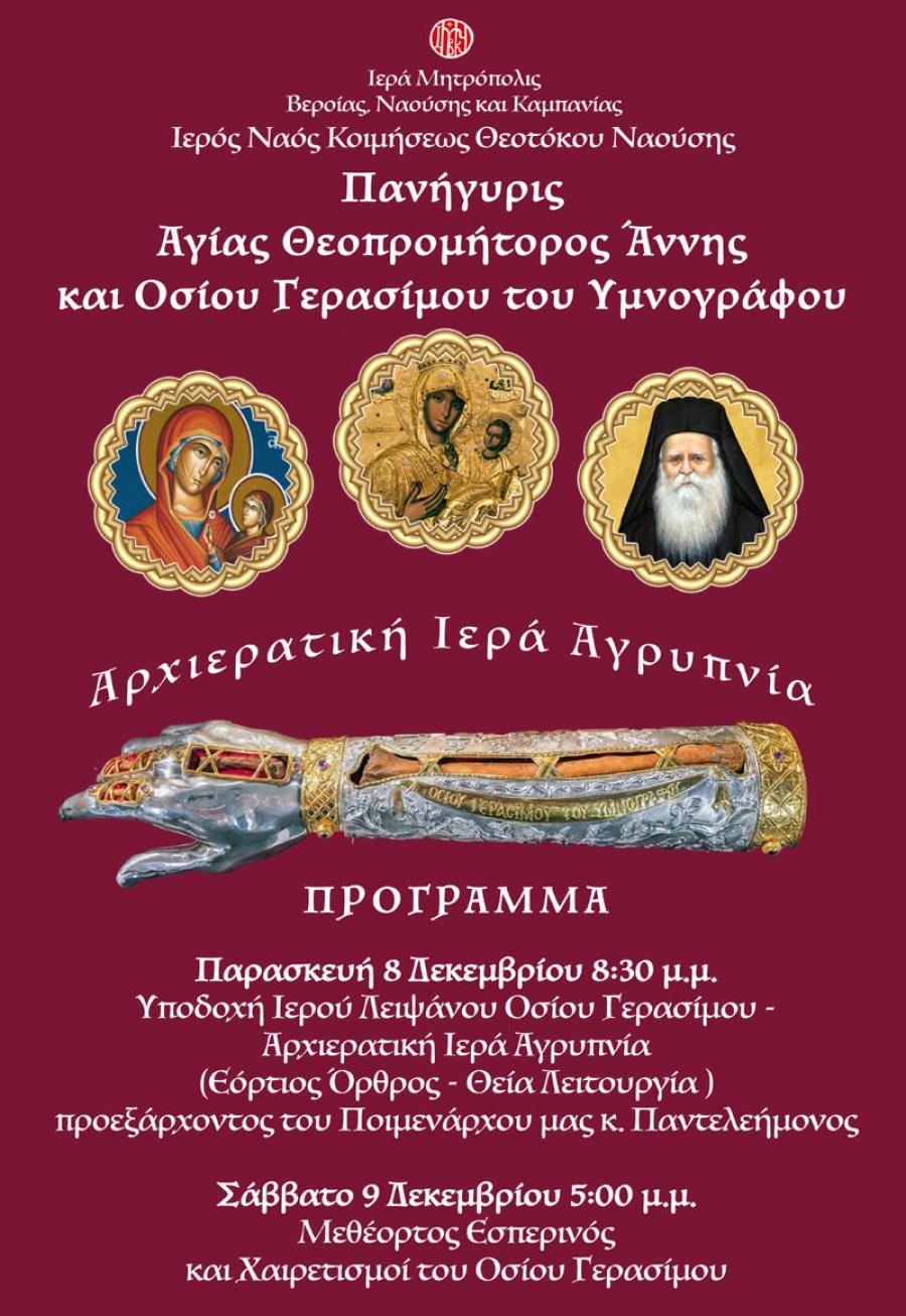 Η Ιερά Μητρόπολις Βεροίας, Ναούσης και Καμπανίας ανακοινώνει στο χριστεπώνυμο πλήρωμα της τοπικής μας Εκκλησίας ότι την Παρασκευή 8 Δεκεμβρίου στις 8:30 μ.μ. στον Ιερό Ναό Κοιμήσεως της Θεοτόκου Ναούσης θα πραγματοποιηθεί η υποδοχή του Ιερού Λειψάνου του Οσίου Γερασίμου του Υμνογράφου.