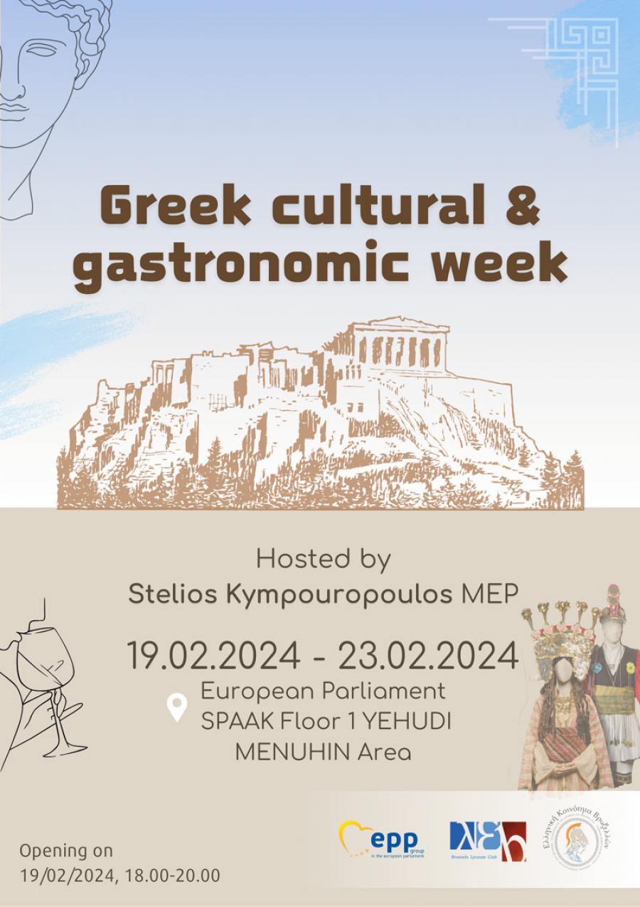 O Ευρωβουλευτής της Νέας Δημοκρατίας Στέλιος Κυμπουρόπουλος σε συνεργασία με το Λύκειο Ελληνίδων Βρυξελλών και την Ελληνική κοινότητα Βρυξελλών, από τη Δευτέρα 19 έως τη Παρασκευή 23 Φεβρουαρίου 2024 θα πραγματοποιήσει στο Ευρωπαϊκό Κοινοβούλιο στο κτίριο PAUL-HENRI SPAAK στον 1ο όροφο στην αίθουσα YEHUDI MENUHIN Area, την έκθεση με τίτλο «Greek Cultural & gastronomic week».