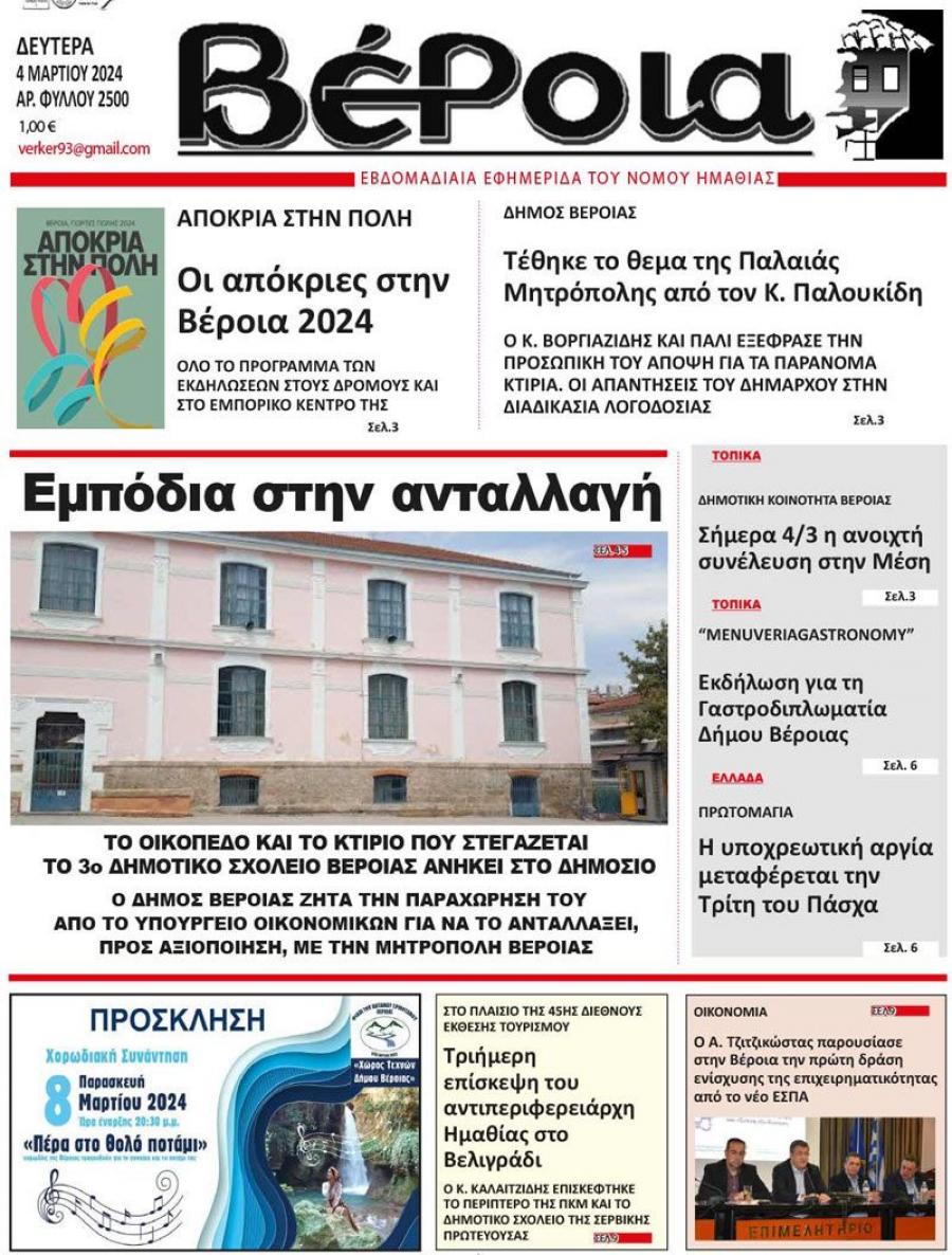Διαβάστε σήμερα Δευτέρα στην εφημερίδα «Βέροια»