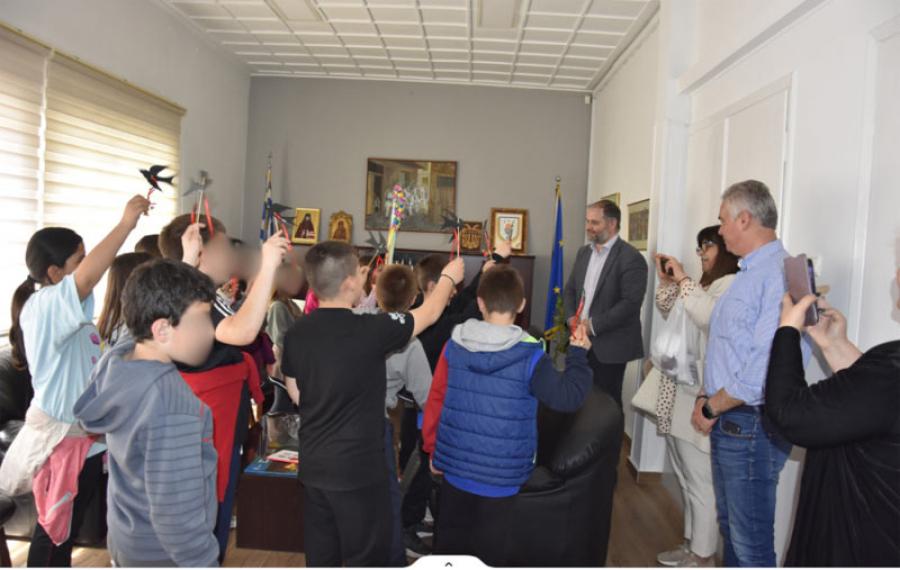 Οι μαθητές επισκέφθηκαν το Δημαρχείο Νάουσας μαζί με την δασκάλα τους κ. Όλγα Τσομεζίδου, ενώ το «Χελιδονίσματα» είναι ένα από τα πιο χαρακτηριστικά έθιμα του ερχομού της ανοίξεως, η συνήθεια δηλαδή να γυρίζουν το πρωί της ημέρας αυτής τα παιδιά της σχολικής ηλικίας τα σπίτια κρατώντας ένα ξύλινο ομοίωμα χελιδονιού και να τραγουδούν για τον ερχομό της ανοίξεως και την επιστροφή των χελιδονιών.