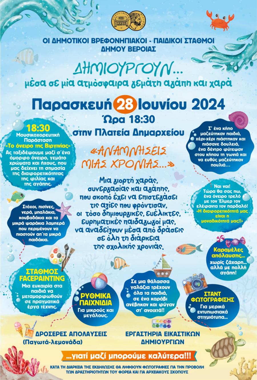 Μια ξεχωριστή γιορτή γεμάτη αναμνήσεις μιας ολόκληρης χρονιάς, με τρυφερά μηνύματα, γεύσεις, παιχνίδια, φαντασία, δημιουργικότητα και με μοναδικό γνώμονα την αγάπη, στοργή και φροντίδα προς τους λιλιπούτειους μαθητές μας, σας περιμένουμεστην πλατεία Δημαρχείου Βέροιας να περάσουμε μαζί σας ένα αξέχαστο απόγευμα.