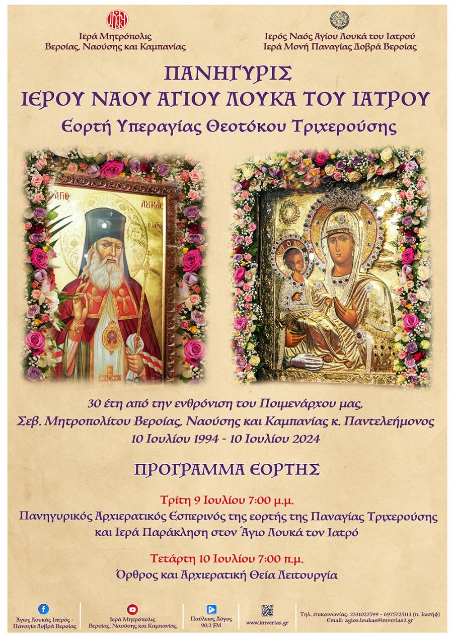 Με αισθήματα πνευματικής χαράς και αγαλλιάσεως η Ιερά Μητρόπολις Βεροίας, Ναούσης και Καμπανίας ανακοινώνει ότι κατά το διήμερο 9 και 10 Ιουλίου εορτάζει και πανηγυρίζει ο Ιερός Ναός του Αγίου Λουκά του Ιατρού στην Ιερά Μονή Παναγίας Δοβρά Βεροίας την εορτή της συνάξεως της Ιεράς Εικόνος της Παναγίας Τριχερούσης.