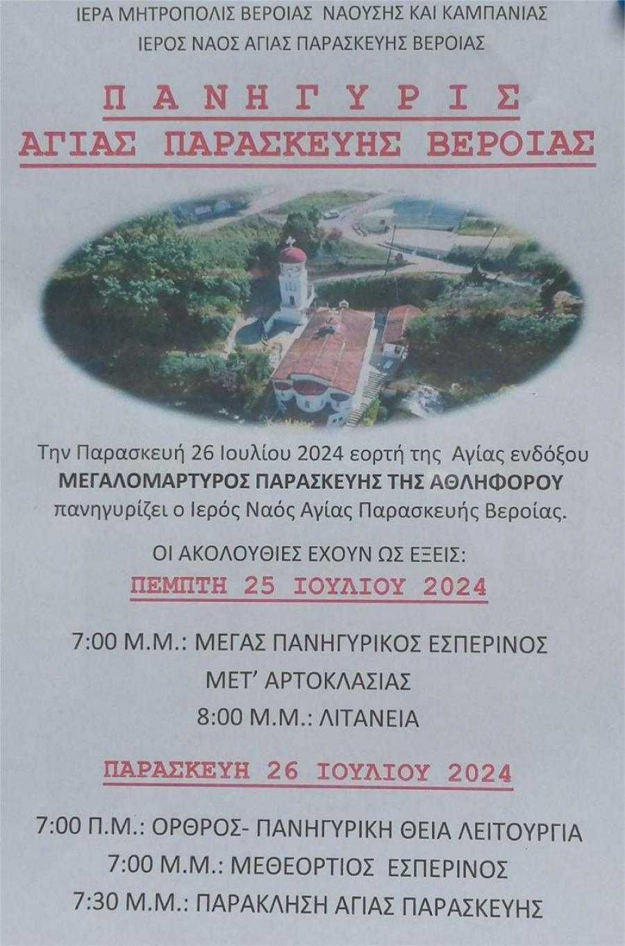 Την Παρασκευή 26 Ιουλίου 2024 εορτή της Αγίας ενδόξου Μεγαλομάρτυρος Παρασκευής της Αθληφόρου πανηγυρίζει ο Ιερός Ναός Αγίας Παρασκευής Βεροίας.