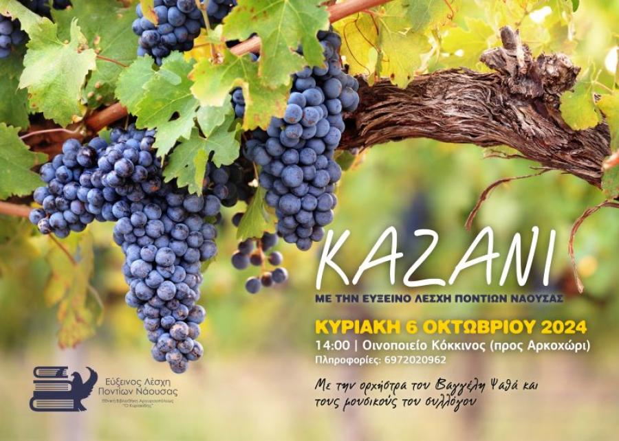 Παραδοσιακό γλέντι σε Καζάνι διοργανώνει για ακόμη μία χρονιά η Εύξεινος Λέσχη Ποντίων Νάουσας, την Κυριακή 6 Οκτωβρίου 2024, στο Οινοποιείο Κόκκινος (περιοχή Δαλαμάρι, στον δρόμο προς Αρκοχώρι). Το Καζάνι θα ξεκινήσει από τις 2:00 το μεσημέρι, με παραδοσιακή μουσική από την ορχήστρα του Βαγγέλη Ψαθά και τους μουσικούς του συλλόγου.