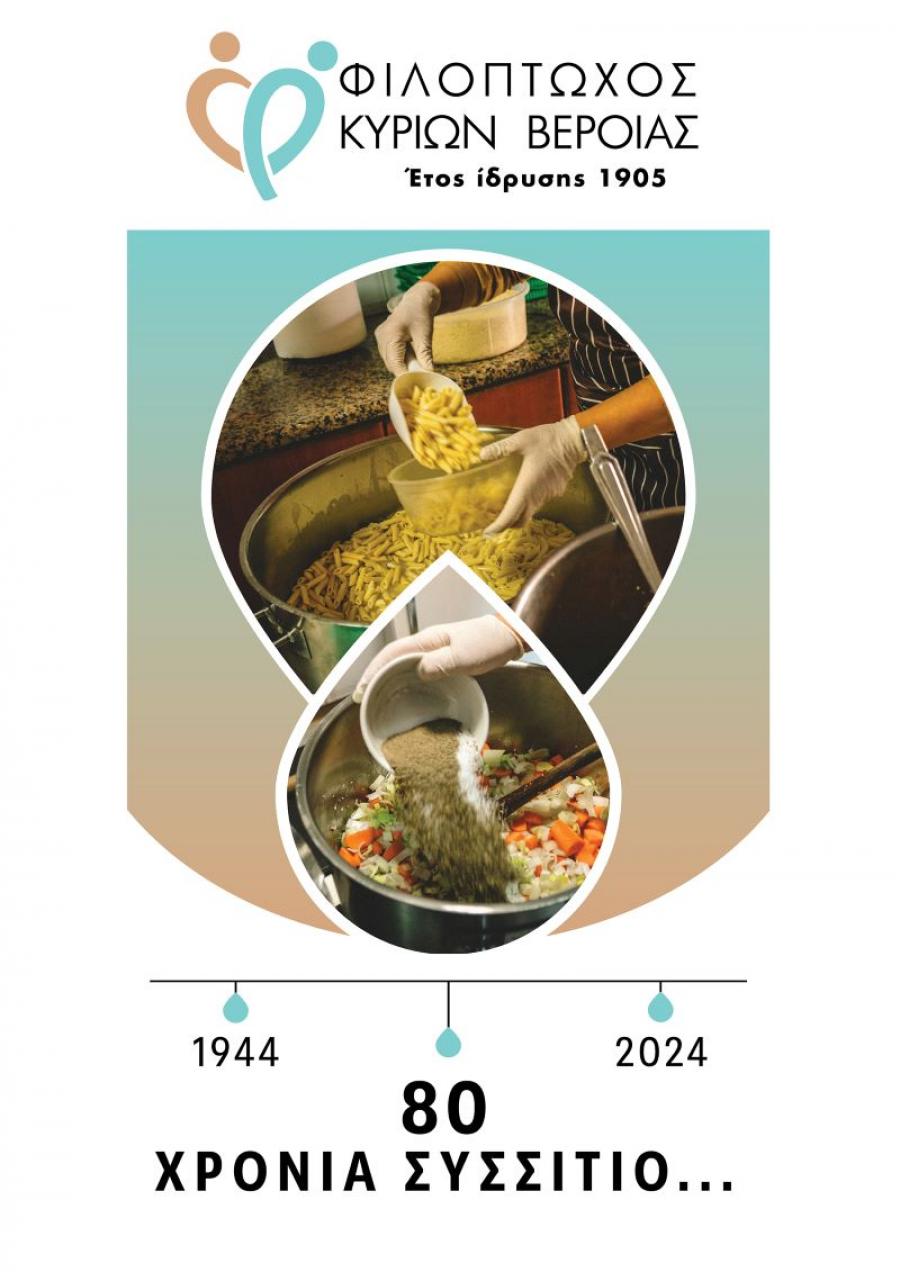 Η Φιλόπτωχος Αδελφότης Κυριών Βέροιας και ο Δήμος Βέροιας, με την ευκαιρία της συμπλήρωσης 119 χρόνων από την ίδρυση του Φιλανθρωπικού Σωματείου και ογδόντα χρόνων συνεχούς παροχής συσσιτίου σε αναξιοπαθούντες πολίτες, προγραμματίζουν εκδήλωση, το Σάββατο 16 Νοεμβρίου 2024 και ώρα 11:00 π.μ.- 13:00 μ.μ. στη διασταύρωση των οδών Προφήτη Ηλία και Ιπποκράτους, με σκοπό την ενημέρωση των πολιτών για το έργο του σωματείου.