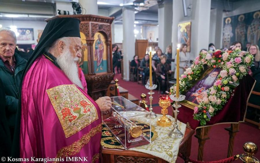 Αὐτοῦ τοῦ μεγάλου ὁσίου τῆς Ἐκκλησίας μας ἔχουμε τήν εὐλογία νά προσκυνήσουμε τό τίμιο καί χαριτόβρυτο λείψανο, γιά νά ἀντλήσουμε χάρη ἀπό τή χάρη του, διότι, ὅπως λέγουν οἱ πατέρες, καί μόνο ἡ ἐπαφή μέ τά ἱερά λείψανα τῶν ἁγίων μᾶς ἁγιάζει καί μᾶς μεταδίδει τή χάρη, τήν ὁποία τόσο πλούσια διέθεταν ἐκεῖνοι στή ζωή τους.