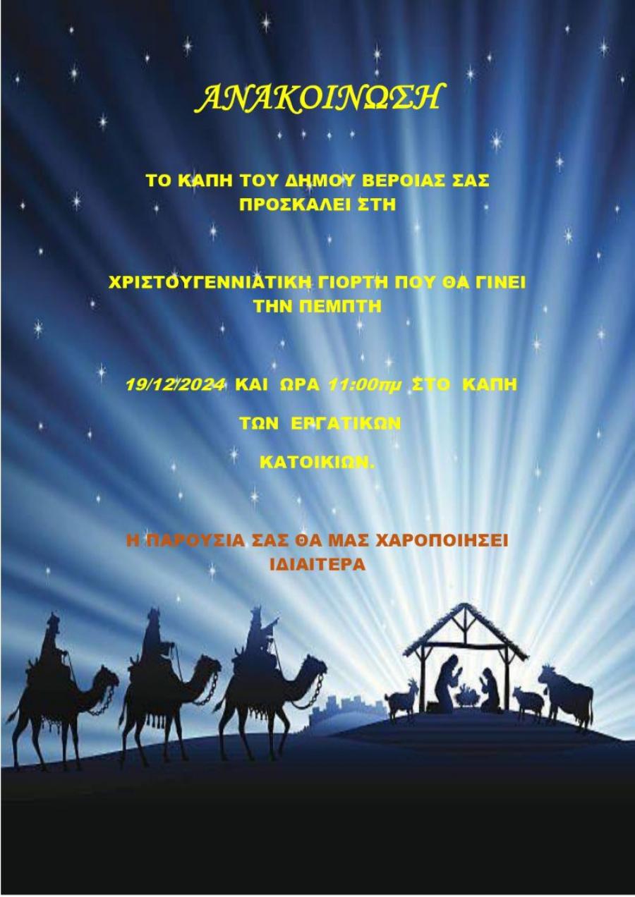Το Τμήμα Προστασίας Τρίτης Ηλικίας της Δ/νσης Κοινωνικής Προστασίας-Παιδείας-Πολιτισμού Δήμου Βέροιας, διοργανώνει Χριστουγεννιάτικη γιορτή για τα μέλη του ΚΑΠΗ, την Πέμπτη 19/12/2024 και ώρα 11πμ στο χώρο του ΚΑΠΗ των Εργατικών Κατοικιών.