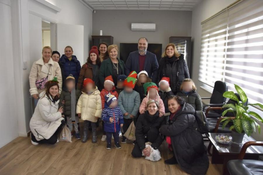 Τους υποδέχθηκαν, ο Δήμαρχος κ. Νίκος Κουτσογιάννης οι Αντιδήμαρχοι κα Άννα Ασλανίδου, κα Άννα Βασιλειάδου και κ. Στέλιος Δάγγας και η δημοτική σύμβουλος κα Ταμάρα Λογγινίδου, οι οποίοι τους ευχήθηκαν χρόνια πολλά, καλές γιορτές και τους μοίρασαν χριστουγεννιάτικα γλυκίσματα.