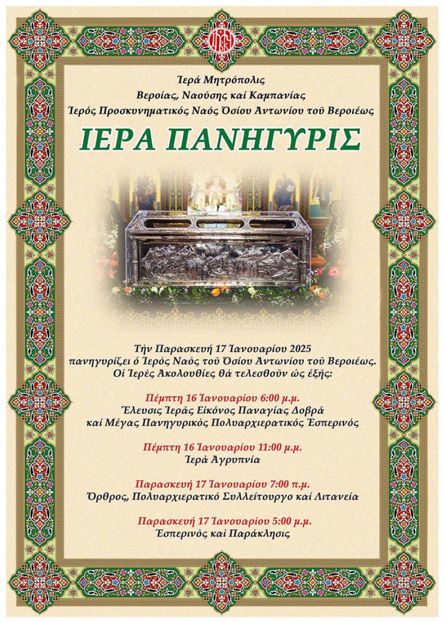 Το πρόγραμμα εορτασμού του πολιούχου της Βέροιας, Οσίου Αντωνίου του Νέου