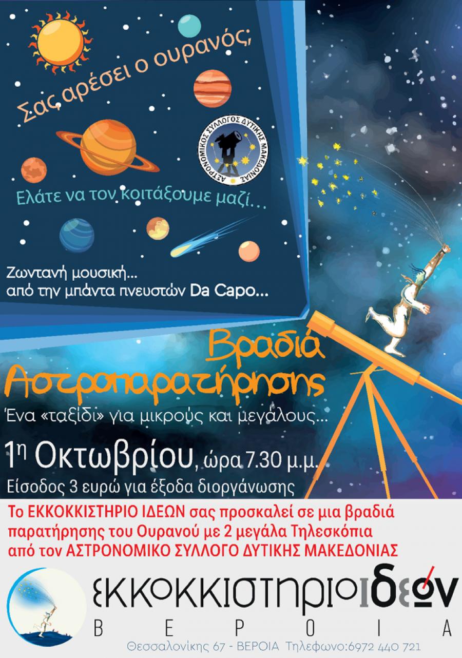 Ο Αστρονομικός Σύλλογος Δυτικής Μακεδονίας θα φέρει τα τηλεσκόπιά του και με την καθοδήγηση των ειδικών επιστημόνων που τα χειρίζονται, θα δουν τον ΔΙΑ, τον μεγαλύτερο πλανήτη του ηλιακού μας συστήματος, τον ΚΡΟΝΟ με τους δακτυλίους του, αλλά και τη ΣΕΛΗΝΗ το ΦΕΓΓΑΡΙ μας όπως έχουμε συνηθίσει να το λέμε, που είναι το φωτεινότερο σώμα στον Ουρανό μετά τον Ήλιο.