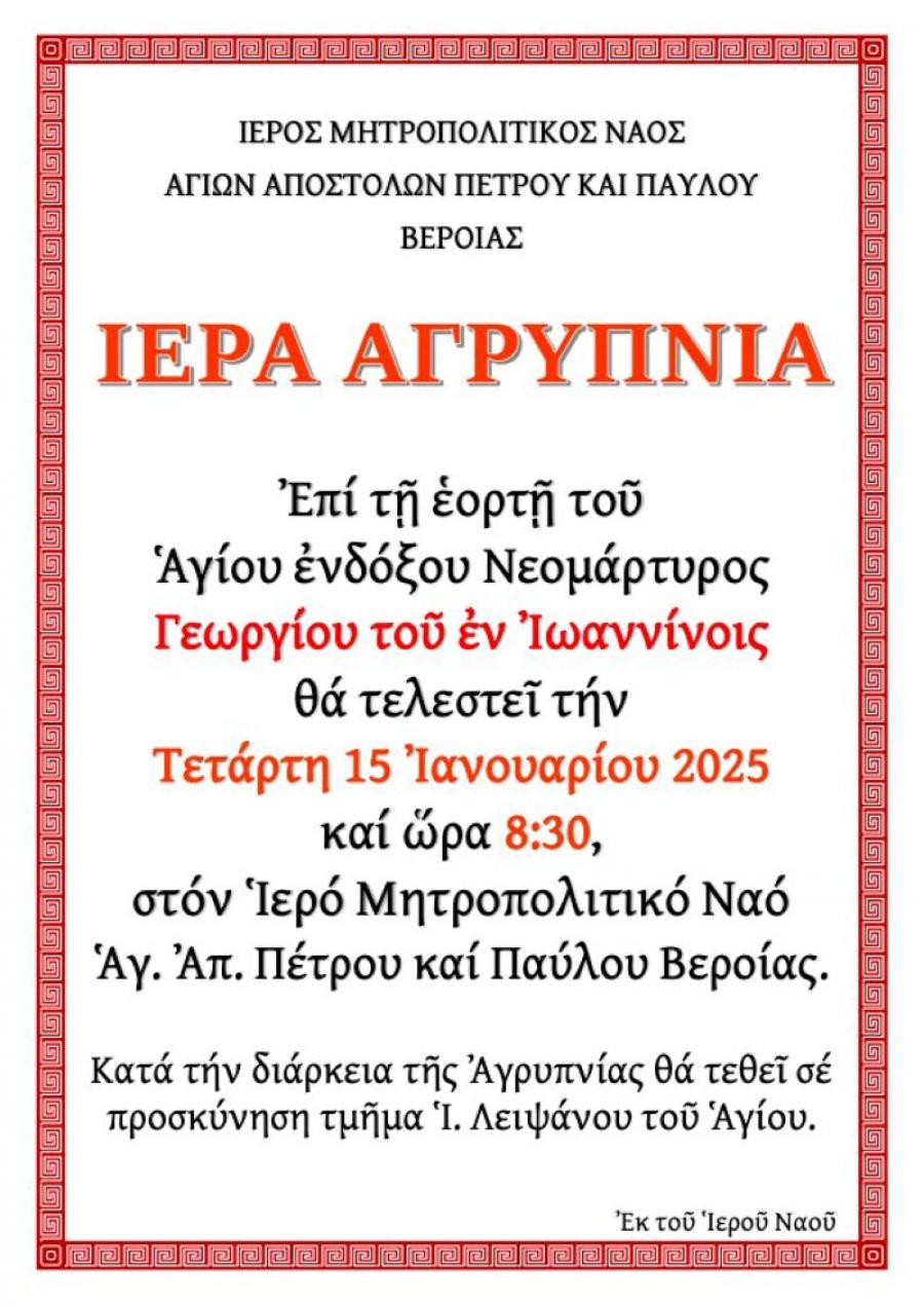 Αγρυπνία την Τετάρτη στον Μητροπολιτικό Ναό Βέροιας