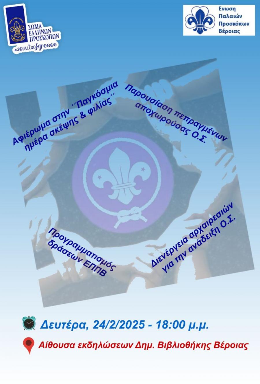 Η Ένωση Παλαιών Προσκόπων Βέροιας καλεί τα μέλη και τους φίλους της σε εκδήλωση αφιέρωμα στην 22α Φεβρουαρίου ως «Παγκόσμια Ημέρα Σκέψης και Φιλίας» που θα πραγματοποιηθεί τη Δευτέρα 24 Φεβρουαρίου 2025 και ώρα 18:00μ.μ. στην αίθουσα εκδηλώσεων της Δημόσιας Βιβλιοθήκης Βέροιας.