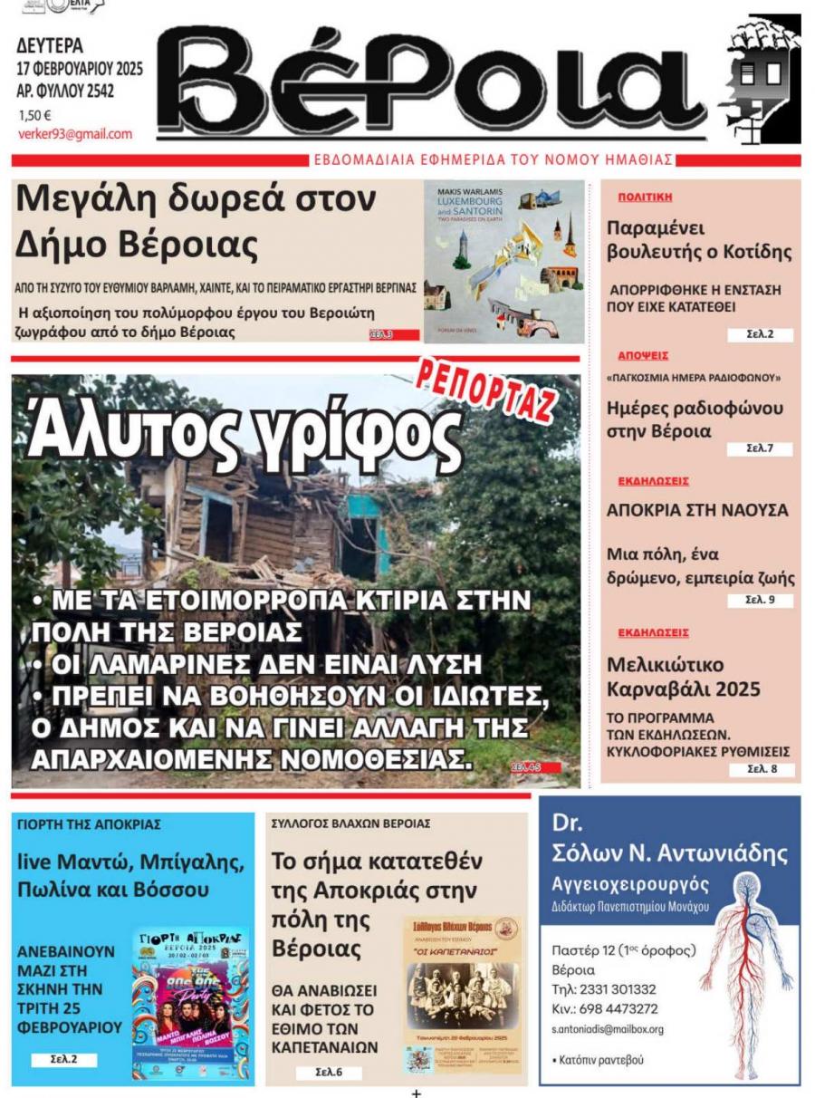 Διαβάστε σήμερα Δευτέρα την εφημερίδα "Βέροια"