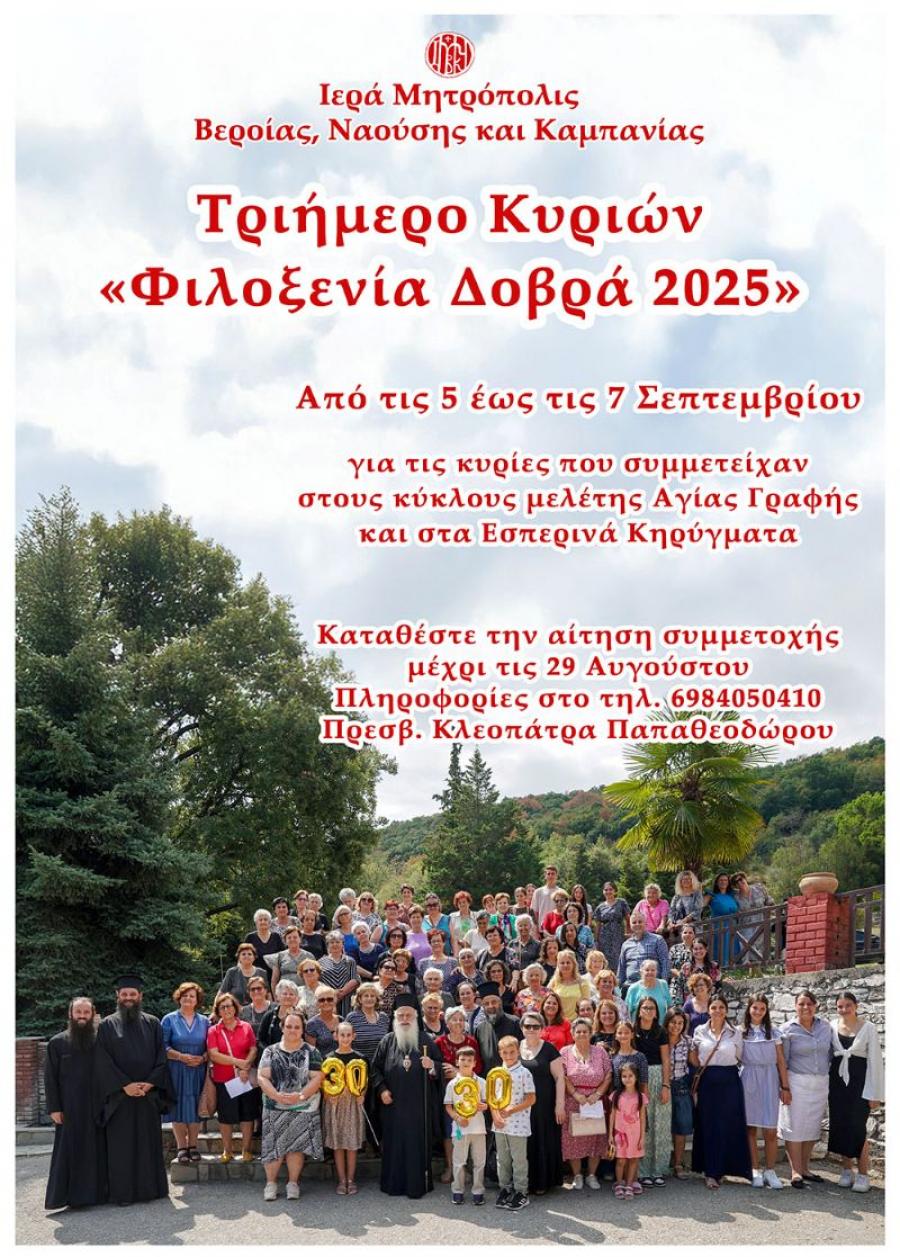 Η Ιερά Μητρόπολις Βεροίας, Ναούσης και Καμπανίας θα πραγματοποιήσει στο πλαίσιο του προγράμματος «Φιλοξενία Δοβρά 2025» το καθιερωμένο τριήμερο κυριών, για τις κυρίες που συμμετείχαν στους Κύκλους Μελέτης Αγίας Γραφής και στα Εσπερινά Κηρύγματα των ενοριών της Μητροπόλεως μας.