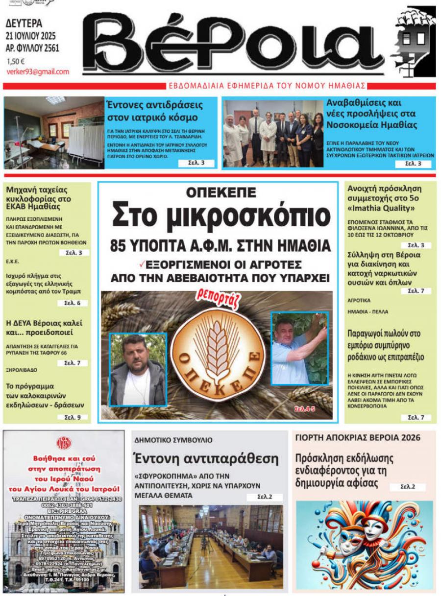 Διαβάστε σήμερα Δευτέρα στην εφημερίδα "Βέροια"