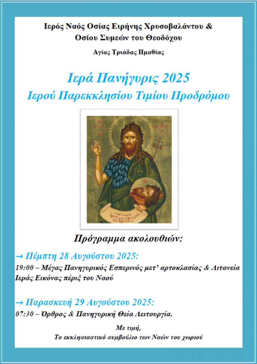 Το εκκλησιαστικό συμβούλιο του Ι.Ν. Αγίας Ειρήνης Χρυσοβαλάντου & Οσίου Συμεών του Θεοδόχου Αγίας Τριάδας σας προσκαλεί στην Ιερά Πανήγυρη του Ιερού Παρεκκλησίου Τιμίου Προδρόμου για το 2025! Θα ήταν χαρά μας, να συμμετάσχετε μαζί μας, στις λατρευτικές εκδηλώσεις που έχουμε ετοιμάσει προς τιμήν της εορτής του Ιερού μας Παρεκκλησίου. Σας προσκαλούμε, λοιπόν, την Πέμπτη 28 Αυγούστου 2025, στις 19:00, στον Μέγα Πανηγυρικό Εσπερινό μετ' αρτοκλασίας και στην Λιτανεία της Ιεράς Εικόνας καθώς και την Παρασκευή 29 Αυγούστου 2025, στις 07:30, στην Πανηγυρική Θεία Λειτουργία.