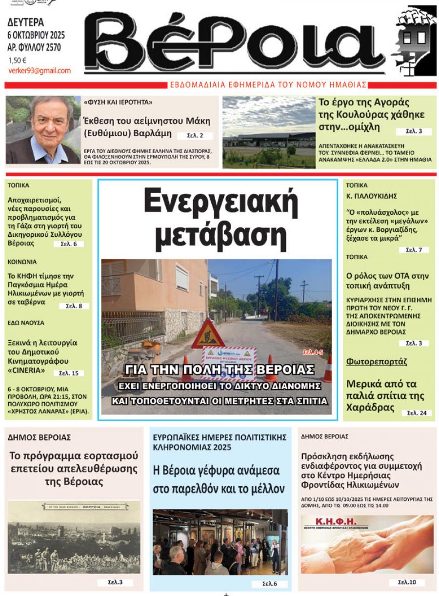 Διαβάστε σήμερα Δευτέρα στην εφημερίδα "Βέροια"