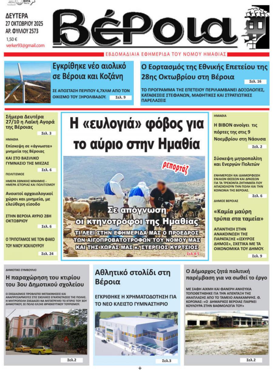 Διαβάστε σήμερα Δευτέρα στην εφημερίδα «Βέροια»