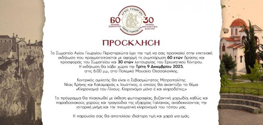 Το Σωματείο Αγίου Γεωργίου Περιστερεώτα έχει την τιμή να σας προσκαλεί στην επετειακή εκδήλωση που πραγματοποιείται με αφορμή τη συμπλήρωση 60 ετών δράσης και προσφοράς του Σωματείου και 30 ετών λειτουργίας του Ερευνητικού Κέντρου. Η εκδήλωση θα λάβει χώρα την Τρίτη 9 Δεκεμβρίου 2025, στις 6.00 μμ, στο Πολεμικό Μουσείο Θεσσαλονίκης.