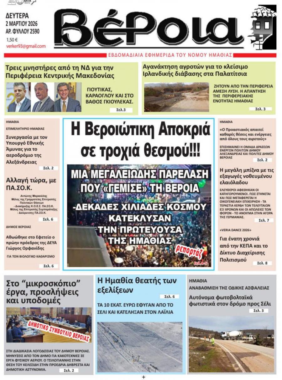 Διαβάστε σήμερα Δευτέρα στην εφημερίδα "Βέροια"