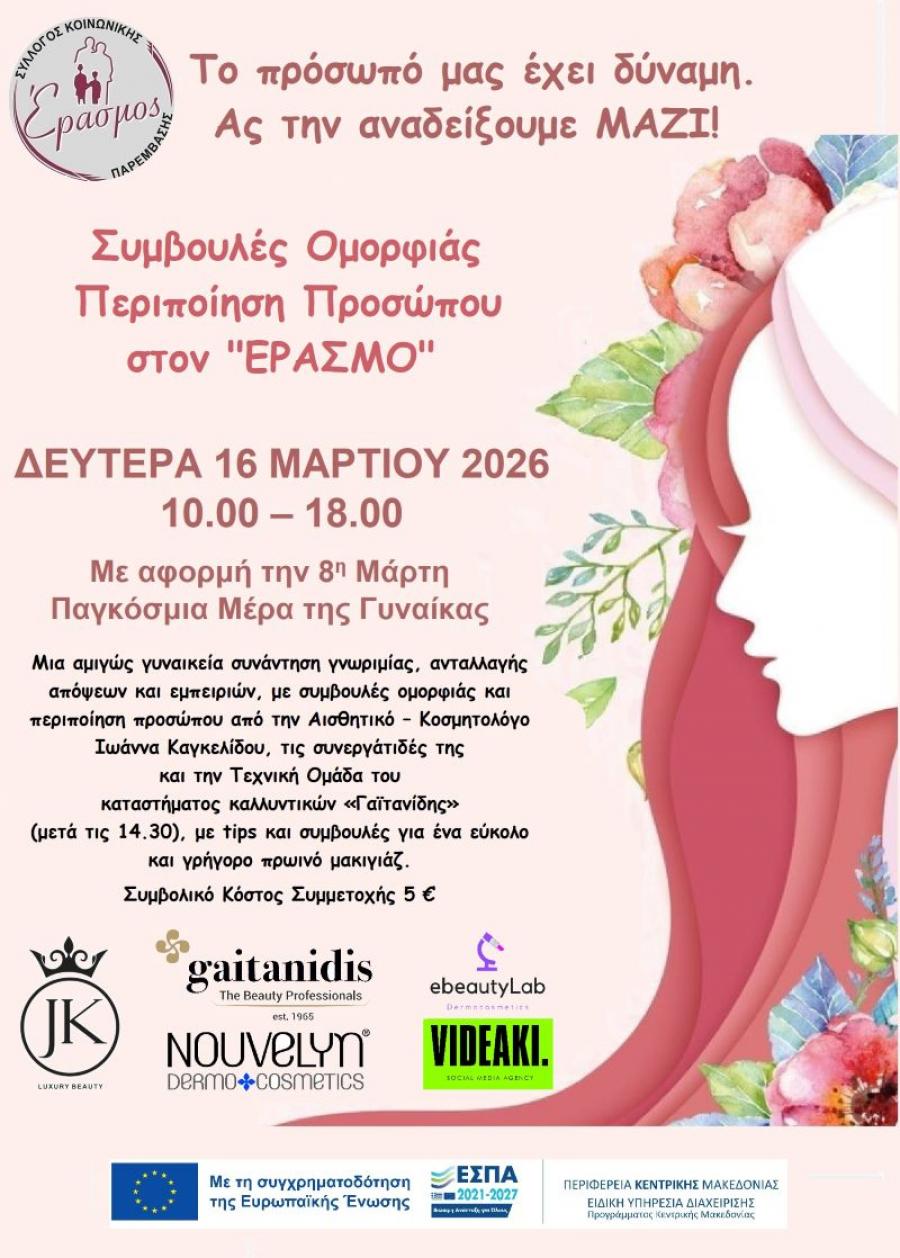 Μια αμιγώς γυναικεία συνάντηση γνωριμίας, με συμβουλές ομορφιάς και περιποίηση προσώπου, θα πραγματοποιηθεί, τη Δευτέρα στις 16 Μαρτίου, από τις 10.00 το πρωί έως τις 18.00 το απόγευμα, στην Αίθουσα Πολλαπλών Χρήσεων (1ος Όροφος) του Συλλόγου Κοινωνικής Παρέμβασης «Έρασμος», από την Αισθητικό – Κοσμητολόγο Ιωάννα Καγκελίδου, τις συνεργάτιδές της και την Τεχνική Ομάδα του καταστήματος καλλυντικών «Γαϊτανίδης» (μετά τις 14.30), με tipsκαι συμβουλές για ένα εύκολο και γρήγορο πρωινό μακιγιάζ.