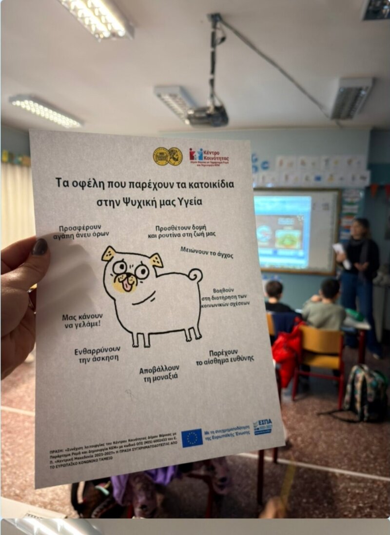Εισηγήτρια της δράσης ήταν η κ. Γονίδου Ελένη, Βοηθός Κτηνιάτρου, η οποία με τρόπο άμεσο και διαδραστικό μετέδωσε στους μαθητές βασικές αρχές για την σωστή αντιμετώπιση των ζώων και τα οφέλη της που έχει η φροντίδα των κατοικίδιων στους ανθρώπους και τα παιδιά.