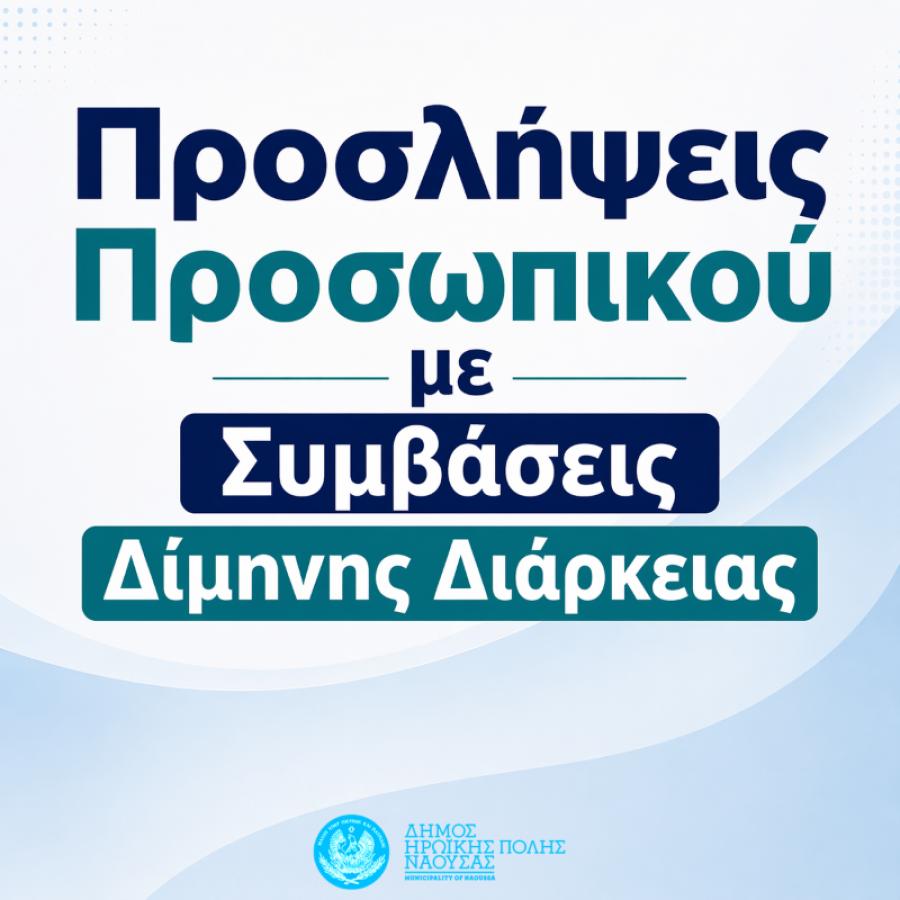Ο Δήμος Ηρωικής Πόλεως Νάουσας προχωρά στην πρόσληψη συνολικά τεσσάρων (4) ατόμων με συμβάσεις εργασίας Ιδιωτικού Δικαίου Ορισμένου Χρόνου, διάρκειας δύο (2) μηνών, για την κάλυψη κατεπειγουσών αναγκών σε υπηρεσίες του Δήμου.