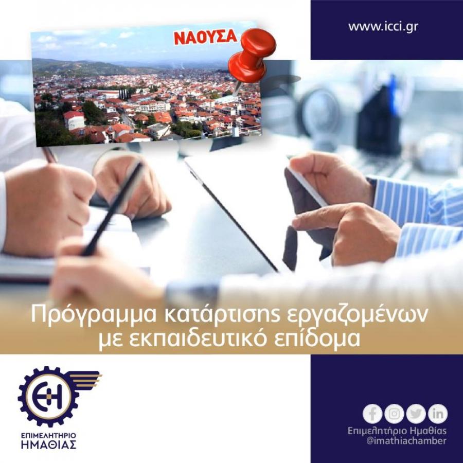 Το Επιμελητήριο Ημαθίας στο πλαίσιο του Επιχειρησιακού Προγράμματος «Κεντρική Μακεδονία 2014-2020» έχει αναλάβει ως Δικαιούχος την υλοποίηση προγραμμάτων κατάρτισης στο πλαίσιο της Πράξης «Ανάπτυξη δεξιοτήτων εργαζομένων στην περιοχή παρέμβασης της Στρατηγικής Βιώσιμης Αστικής Ανάπτυξης (ΣΒΑΑ) Νάουσας» με MIS 5073390.