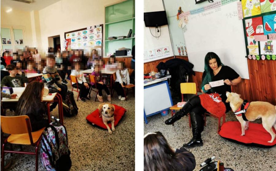 Η κα Κακαμούκα μάς παρουσίασε με ενδιαφέρον το επάγγελμα της κτηνιάτρου, καθώς, επίσης, μάς μίλησε για τις δυσκολίες και τις χαρές που προσφέρει η επαφή με τα ζώα. Στη συνέχεια, μας επισκέφθηκε στις 9/2/23 η κα Κατερίνα Παπαποστόλου, Διευθύντρια του ΔΣ Πλατάνου – Πρασινάδας και συγγραφέας, παρέα με τη Διώνη, τον εκπαιδευμένο και διαπιστευμένο σκύλο της. Η κα Παπαποστόλου μάς έδωσε τη δυνατότητα να προβληματιστούμε για το ζήτημα των αδέσποτων ζώων, να μυηθούμε στη ζωή και στην καθημερινότητα ενός σκύλου και να απολαύσουμε την παρέα της Διώνης.