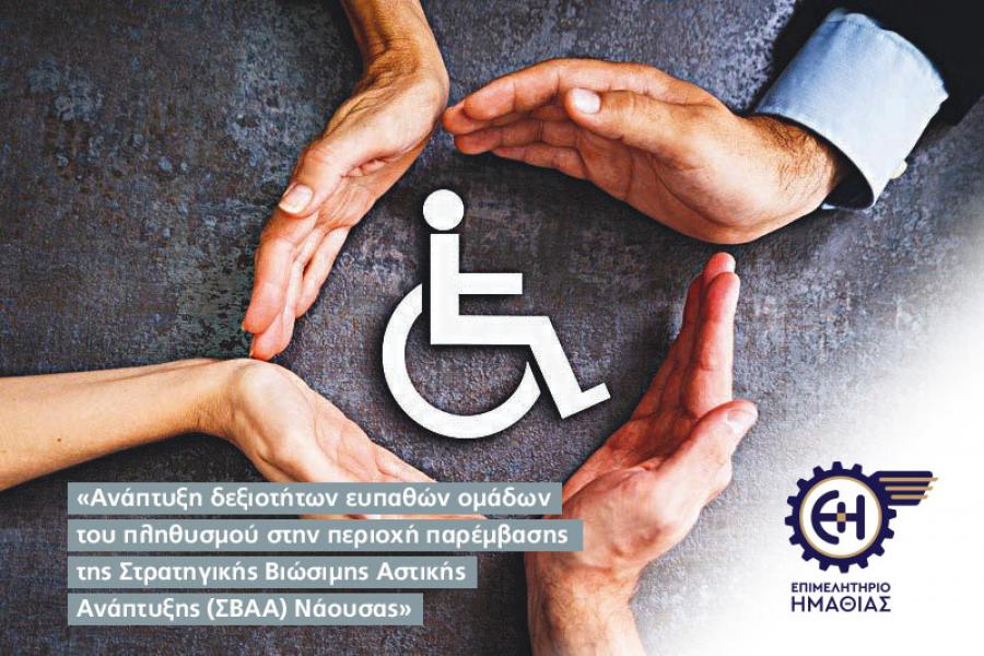 Μέσω της παροχής συμβουλευτικών υπηρεσιών και της υλοποίησης προγράμματος κατάρτισης επιδιώκεται η προετοιμασία 20 ανέργων, ωφελουμένων, άτομα με Αναπηρία, που κατοικούν στην περιοχή παρέμβασης της Στρατηγικής Βιώσιμης Αστικής Ανάπτυξης (ΣΒΑΑ) Νάουσας αλλά και η στήριξη ευπαθών ομάδων του πληθυσμού́ με παρεμβάσεις που συμβάλλουν στην κοινωνική́ τους ενσωμάτωση, στη μείωση της ανεργίας και την ένταξή τους στην αγορά́ εργασίας, καθώς και στη βελτίωση του βιοτικού́ επιπέδου και της κοινωνικής τους θέσης, μέσω της υλοποίησης δράσεων ενίσχυσης των προσόντων και απόκτησης επαγγελματικής εμπειρίας.