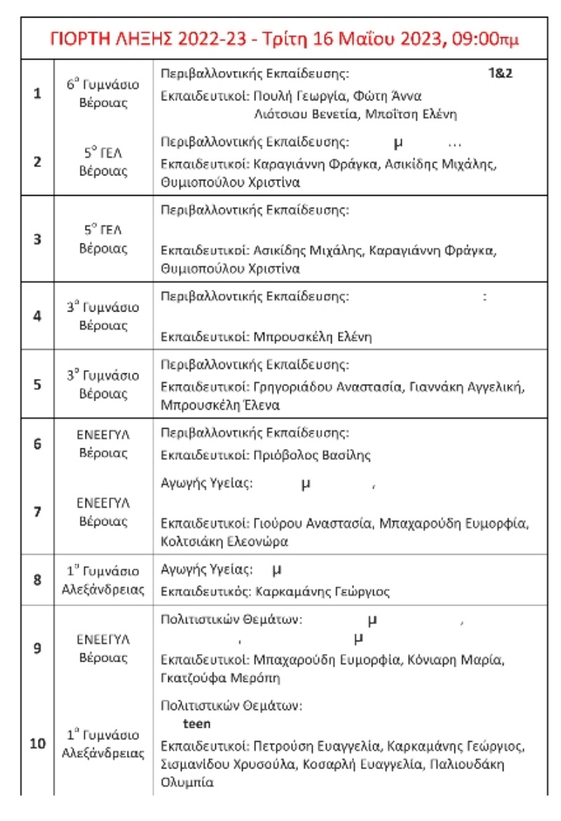Η Γιορτή Λήξης σχολικού έτους 2022-23 θα λάβει χώρα στο Παύλειο Πολιτιστικό Κέντρο Βέροιας (Μεντρεσέ Τζαμί) την Τρίτη 16 Μαΐου, ώρα έναρξης 9:00. Αποτελεί την επισφράγιση των κόπων μιας ολόκληρης σχολικής χρονιάς, στοχεύει στην αλληλεπίδραση των συμμετεχόντων, στη διάχυση των αποτελεσμάτων των Προγραμμάτων Σχολικών Δραστηριοτήτων και απευθύνεται σε όλα τα μέλη της εκπαιδευτικής κοινότητας – μαθητές/-ριες, εκπαιδευτικούς, γονείς.