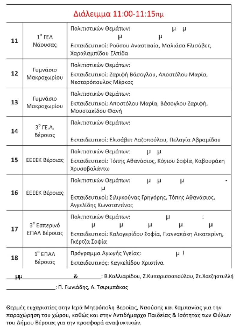 Η Διεύθυνση Δευτεροβάθμιας Εκπαίδευσης Ημαθίας ευχαριστεί την Ιερά Μητρόπολη Βεροίας, Ναούσης και Καμπανίας για την ευγενική παραχώρηση του Παύλειου Πολιτιστικού Κέντρου για την υλοποίηση της εκδήλωσης. Ευχαριστεί επίσης την Αντιδήμαρχο Παιδείας & Ισότητας των Φύλων του Δήμου Βέροιας για την προσφορά αναψυκτικών.