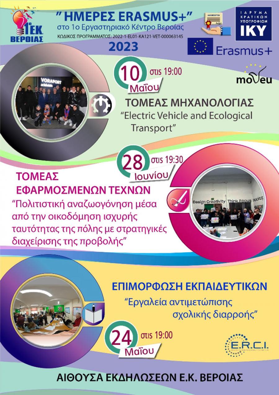 Την Τετάρτη 24 Μαΐου 2023 στις 19:00 στην αίθουσα εκδηλώσεων του συγκροτήματος ΕΠΑΛ/ΕΚ θα παρουσιαστούν τα αποτελέσματα διαπιστευμένου σχεδίου κινητικότητας Erasmus+ του 1ου ΕΚ Βέροιας που υλοποιήθηκε με 9 εκπαιδευτικούς του 1ου Εργαστηριακού Κέντρου Βέροιας στην Κύπρο τον Δεκέμβριο του 2022 με θέμα: "Εργαλεία αντιμετώπισης σχολικής διαρροής".