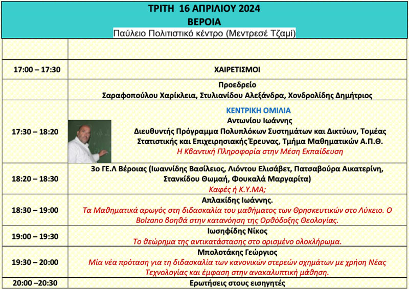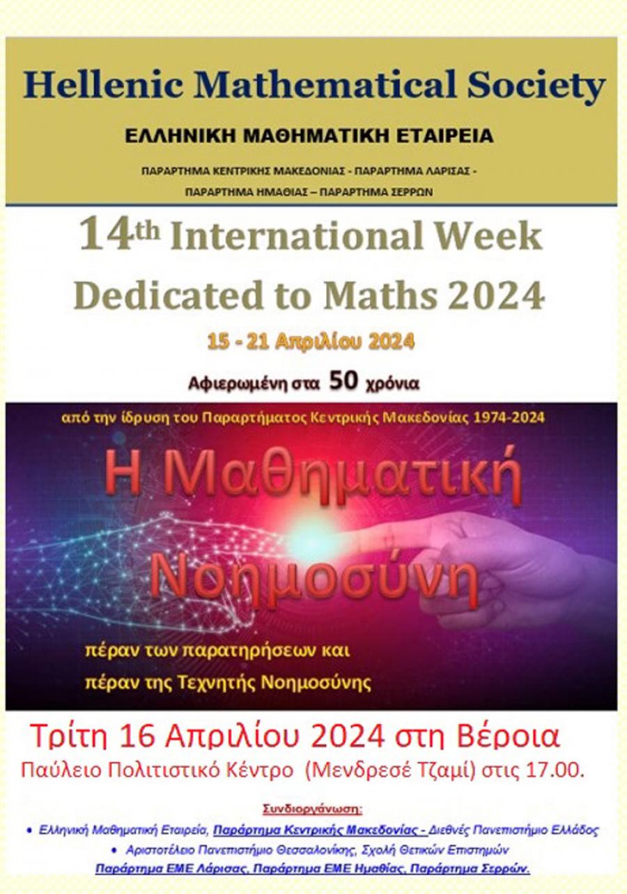 Η 14η Διεθνής Μαθηματική Εβδομάδα, που διοργανώνεται κάθε χρόνο από το Παράρτημα της Κεντρικής Μακεδονίας της Ελληνικής Μαθηματικής Εταιρείας που εδρεύει στη Θεσσαλονίκη, θα πραγματοποιηθεί φέτος για πρώτη φορά και στη Βέροια.