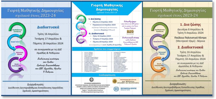 Με μεγάλη επιτυχία πραγματοποιήθηκε την Τρίτη 16, την Τετάρτη 17 και την Πέμπτη 18Απριλίου 2024, διαδικτυακά στην πλατφόρμα Webex, η δεύτερη φάση της εκπαιδευτικής εκδήλωσης «Γιορτή Μαθητικής Δημιουργίας Σχολικού Έτους 2023-24» για την παρουσίαση των Προγραμμάτων Σχολικών Δραστηριοτήτων (Περιβαλλοντικής Εκπαίδευσης, Αγωγής Υγείας, Πολιτιστικών Θεμάτων και Αγωγής Σταδιοδρομίας), η οποία διοργανώθηκε από τη Διεύθυνση Δευτεροβάθμιας Εκπαίδευσης Ημαθίας,σε συνεργασία με τις Διευθύνσεις Δευτεροβάθμιας Εκπαίδευσης Ρεθύμνουκαι Αργολίδας, δια των Υπευθύνων Σχολικών Δραστηριοτήτων.