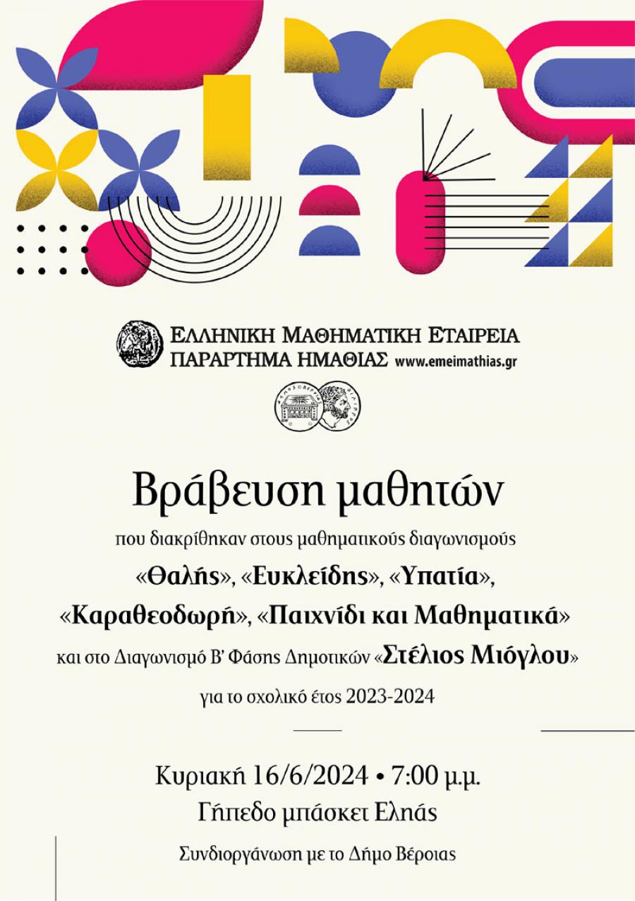 Το Παράρτημα Ημαθίας της Ελληνικής Μαθηματικής Εταιρείας βραβεύει τους μαθητές που διακρίθηκαν στους διαγωνισμούς: «Θαλής», «Ευκλείδης», «Υπατία», «Καραθεοδωρή», «Παιχνίδι και Μαθηματικά» και στο διαγωνισμό Β’ φάσης δημοτικών «Στέλιος Μιόγλου» για το σχολικό έτος 2023-2024. Η τελετή βράβευσης θα πραγματοποιηθεί τηνΚυριακή 16 Ιουνίου 2024 στις 7:00 μ.μ. στο Γήπεδο Μπάσκετ Εληάς σε συνδιοργάνωση με το Δήμο Βέροιας.