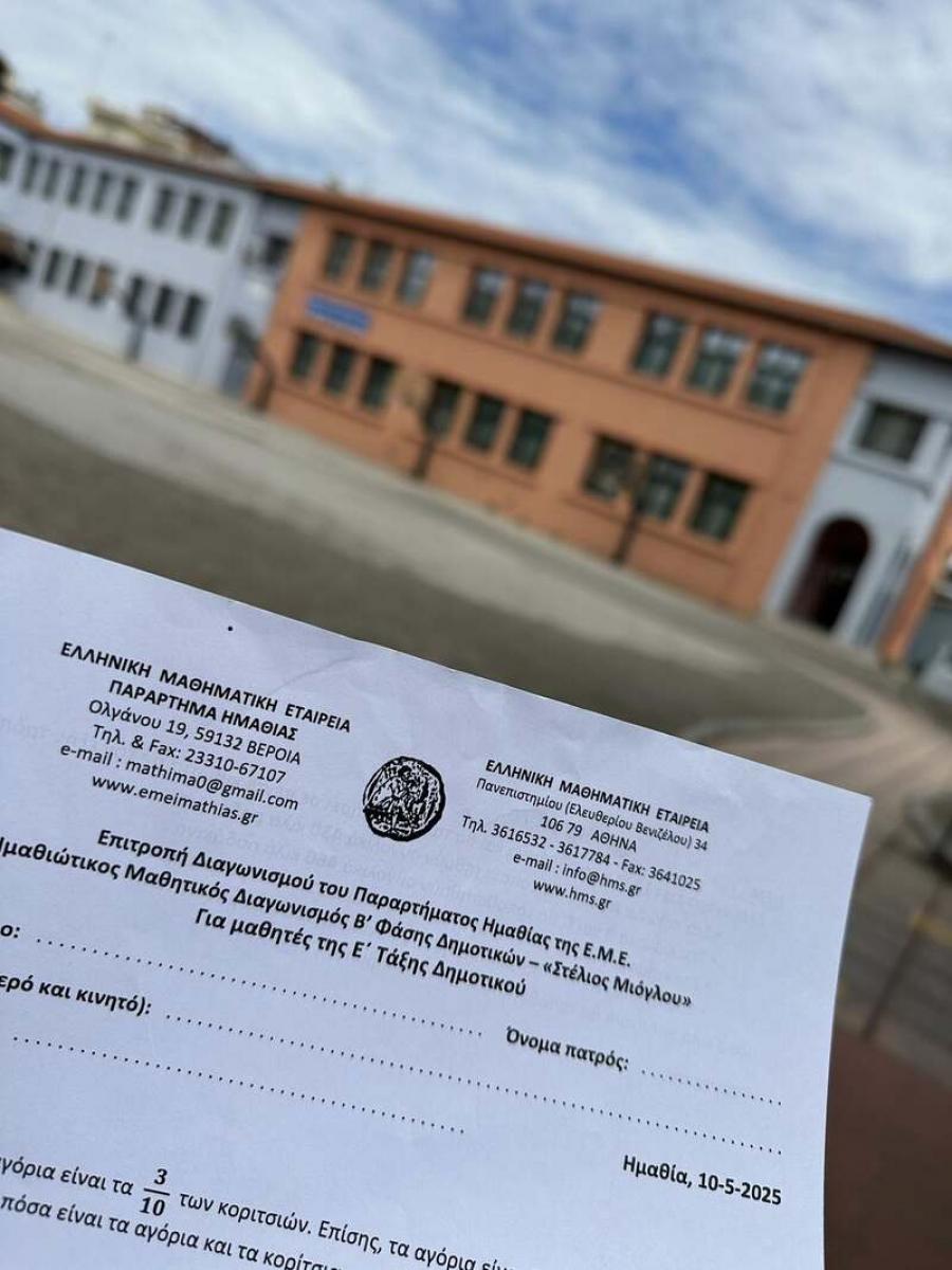 Το Σάββατο 10 Μαΐου 2025 πραγματοποιήθηκε με επιτυχία στο 6ο Δημοτικό Σχολείο Βέροιας η Β’ Φάση του διαγωνισμού «Παιχνίδι και Μαθηματικά», γνωστή και ως διαγωνισμός «Στέλιος Μιόγλου», με τη συμμετοχή 211 μαθητών και μαθητριών της Ε’ και ΣΤ’ τάξης από Δημοτικά Σχολεία της περιοχής.