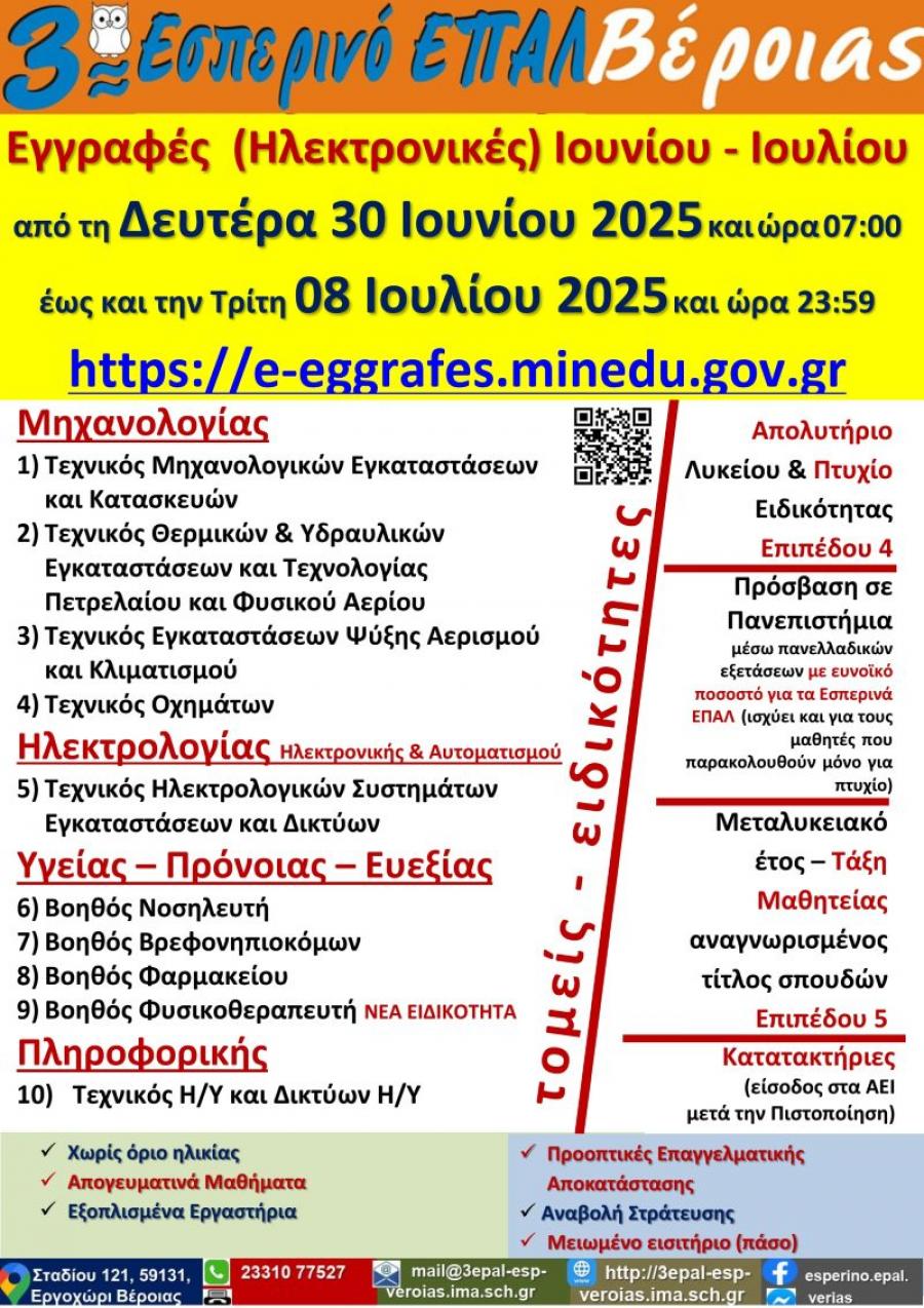 Τελευταίες Ημέρες Εγγραφών (Ηλεκτρονικών) στο 3ο Εσπερινό ΕΠΑΛ Βέροιας