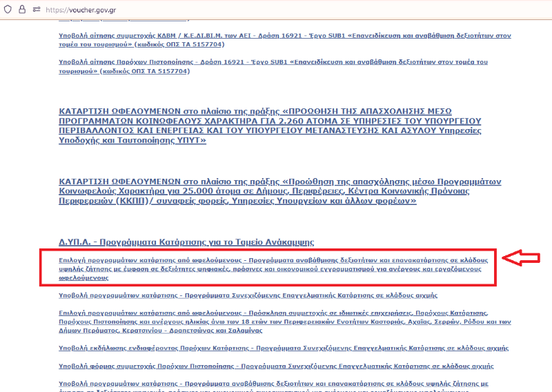Η επιλογή αντικειμένου κατάρτισης και η ενεργοποίηση της επιταγής σου.