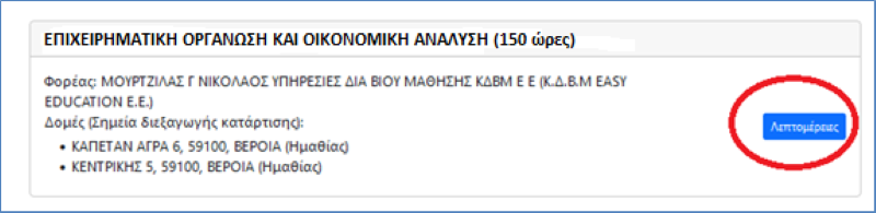 Ο πάροχος κατάρτισης “Μουρτζίλας Νικόλαος (ΚΔΒΜ EasyEducation)» θα εμφανιστεί αυτόματα επιλεγμένος . Πατάς το κουμπί λεπτομέρειες .