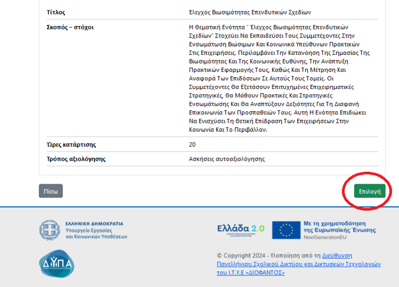 Στο τέλος της σελίδας με τις πληροφορίες του προγράμματος πατάς το κουμπί «Επιλογή». Με αυτόν το τρόπο ολοκληρώνεται η διαδικασία επιλογής προγράμματος.