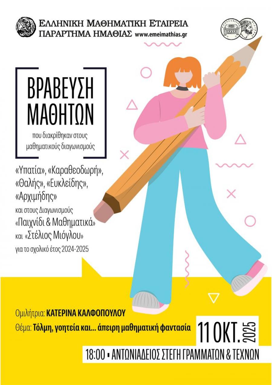 Το Παράρτημα Ημαθίας της Ελληνικής Μαθηματικής Εταιρείας βραβεύει τους μαθητές που διακρίθηκαν στους διαγωνισμούς: «Θαλής», «Ευκλείδης», «Υπατία», «Καραθεοδωρή», «Παιχνίδι και Μαθηματικά» και στο διαγωνισμό Β’ φάσης δημοτικών «Στέλιος Μιόγλου» για το σχολικό έτος 2024-2025. Η τελετή βράβευσης θα πραγματοποιηθεί το Σάββατο 11 Οκτωβρίου 2025 στις 6:00 μ.μ. στην Αντωνιάδειο Στέγη Γραμμάτων & Τεχνών. Την εκδήλωση θα τιμήσει με την παρουσία και την ομιλία της η διακεκριμένη μαθηματικός και συγγραφέας Κατερίνα Καλφοπούλου, η οποία θα παρουσιάσει εισήγηση με τίτλο: